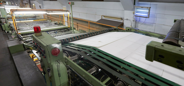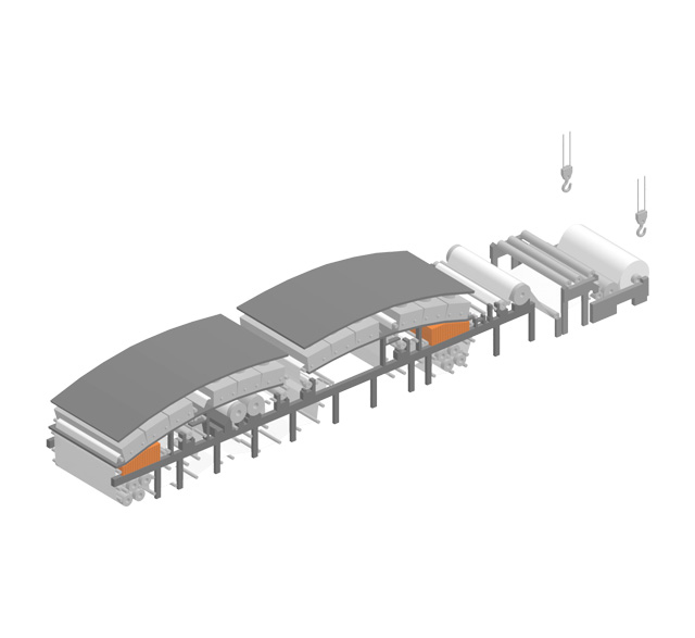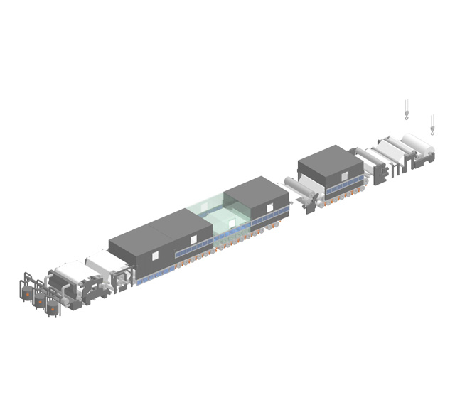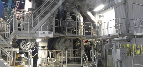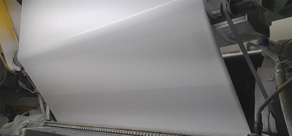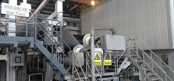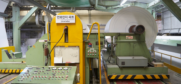 Coating process is coating the surface of the paper in order to enhance the paper’s printability and reproducibility of image. The paper that is sent to the coating part (coater) after being released from the unwinder undergoes the process of making the coating surface uniform with blade, load and others then it is completed into a product after being dried in the dryer. Depending on the product, gloss is added through super calendar process.