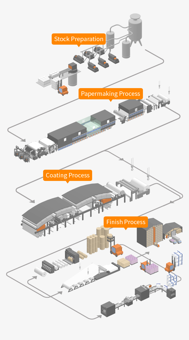 >Stock preparation, as a process immediately before sending the paper stock to the papermaking machine, determines the fundamental quality characteristics of the paper. Pulp, which is the main ingredient of the paper, undergoes dissociation and refining process, the blending process of mixing various chemicals including filler. Filtering process in the cleaner, scree and others then is sent to the head box of the paper making machine.